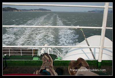 We hebben geen zitplaatsen maar we zijn ingedeeld in een kamer, kamer 408. De ruimte is moeilijk te vinden en het blijkt een klein kamertje aan de buitenkant van de romp te zijn. Een groot raam geeft een mooi uitzicht over de zee. Binnen in de kamer zitten drie jonge jongens en een handvol bejaarde vrouwen. De ogen gaan open bij het zien van de westerlingen. Uitnodigend maken ze gebaren met hun handen dat we de schoenen uit moeten doen en bij hun komen zitten. Maar niet voor ons! Een snelle grap en een afwijzend gebaar. Wij plaatsen onze rugzakken in het kamertje en met veel geimproviseerde handgebaren vragen we de vrouwen om een oogje op onze bagage te houden. Dat is natuurlijk geen probleem en na een half dozijn buigingen en kamsamida’s - dank je wel’s - zoeken we de weg naar buiten. We volgens gewoon een stroom passagiers de frisse zeelucht in.